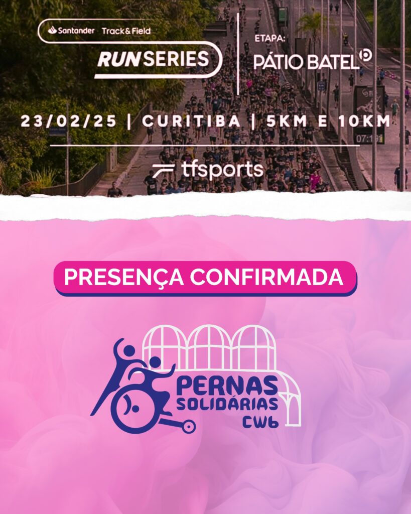 Cadastro Pernas Solidárias CWB | Track&Field RUNSERIES (Etapa PÁTIO BATEL) 15/02/2025 por admin Cadastros para participar conduzindo: https://forms.gle/EY6M9Tz9h5QGtdeZ7